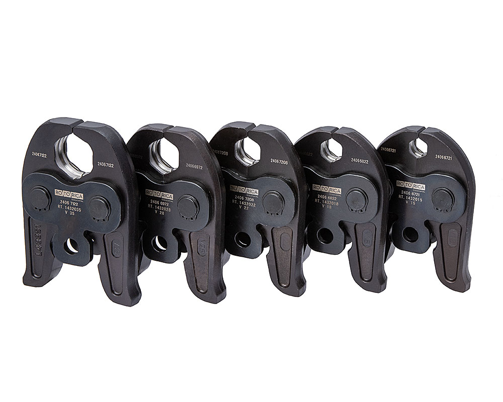 Пресс-клещи для монтажа пресс-фитингов тонкостенных металлических трубопроводов. Профиль прессования V. Типоразмеры от 15 до 35 мм. Совместимы с прессом Rotorica Rotorica ProPresser M54E 32кН.