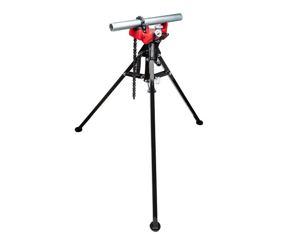Литая конструкция опорной плиты со встроенными цепными тисками, опорой для трубы, гибочным устройством, на складной треноге. Цепь и губки из износостойкой легированной стали. Для труб диаметром от 6 до 165 мм (⅛» – 6″).