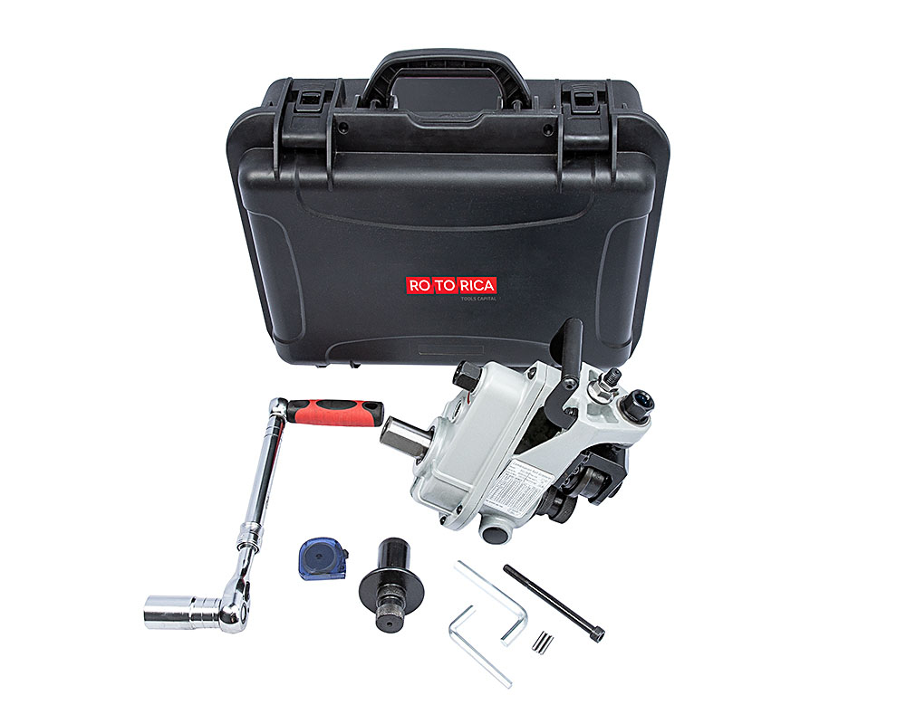 Портативный ручной желобонакатчик с возможностью подключения к резьбонарезным станкам. Диапазон диаметров труб 1″ и 2″ — 6″. Вес 12,5 кг.