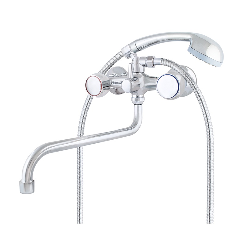 Предназначен для установки в ванные комнаты. Корпус смесителя и ручка переключателя из цинкового сплава. Округлые пластмассовые ручки. Латунные кран-букса и дивертор шарового типа. S-излив 300 мм — нержавеющая сталь с пластмассовым аэратором. Эксцентрики и декоративные розетки из нержавеющей стали. Держатель для душа высокопрочный ABS пластик. Душевой шланг 1,5 м верхняя оплетка шланга — нержавеющая сталь, силиконовые прокладки.
