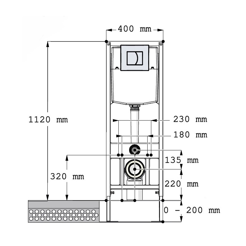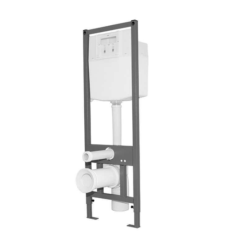 - Наличие 2 пар отверстий с межосевым расстоянием 180 или 230 мм и регулировка высоты рамы (от 1100 до 1250 мм) дает возможность монтажа практически всех видов подвесных унитазов