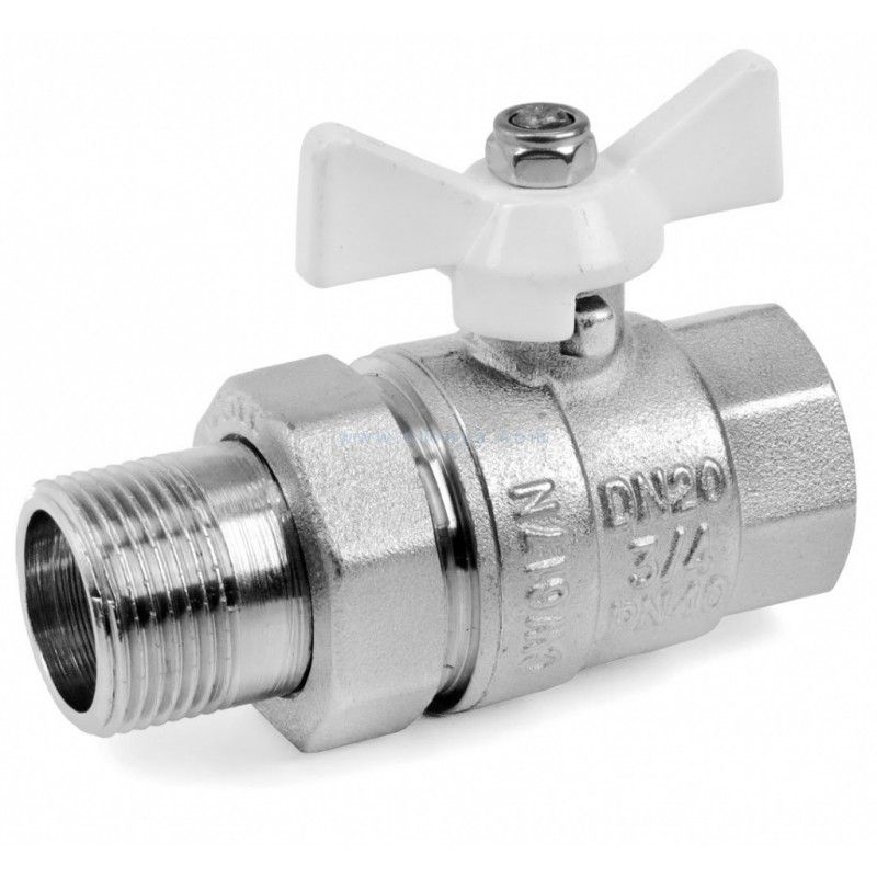 (VT.227.NW) Прямой полнопроходной ремонтопригодный шаровой кран с увеличенным ресурсом. Соединен накидной гайкой с резьбовым полусгоном. Корпуса деталей – латунные, никелированные. Кран оснащен ручкой типа «бабочка» с утолщенной стенкой из алюминиевого сплава и эпоксидной покраской белого цвета. Резьба присоединений – внутренняя/наружная.