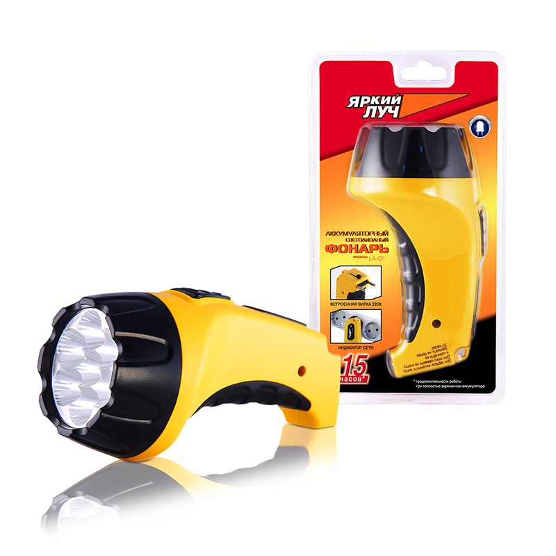 Предназначен для освещения предметов и местности при отсутствии стационарных источников света. Источник света — 7 сверхъярких светодиодов. Кислотно-свинцовый аккумулятор 4В, 0,8 Ач. Оснащен встроенной вилкой для прямой зарядки от 220В. Материал корпуса фонаря — прочный ABS пластик.