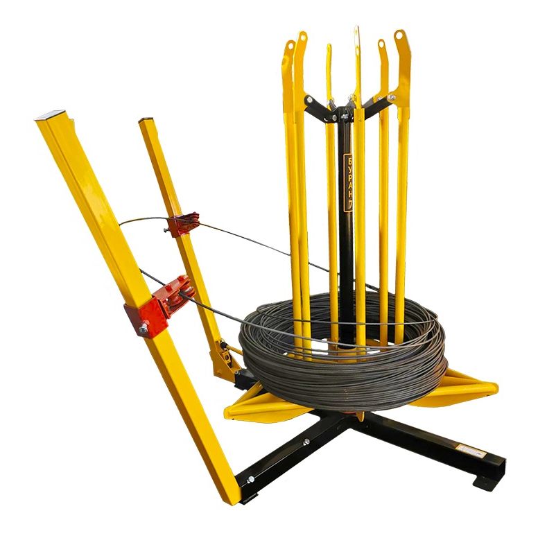 Представляет собой прочную стальную конструкцию с возможностью регулировки посадочного диаметра под внутренний диаметр бухты. Вертикальная нагрузка на бухтодержатель возможна до 5 тонн. В конструкцию добавлены две штанги с направляющими роликами (подвижная штанга управляет тормозной лентой, усилие регулируемое, стационарная может устанавливаться как справа, так и слева, в зависимости от навивки арматуры) и система автоматического торможения с фрикционной лентой.