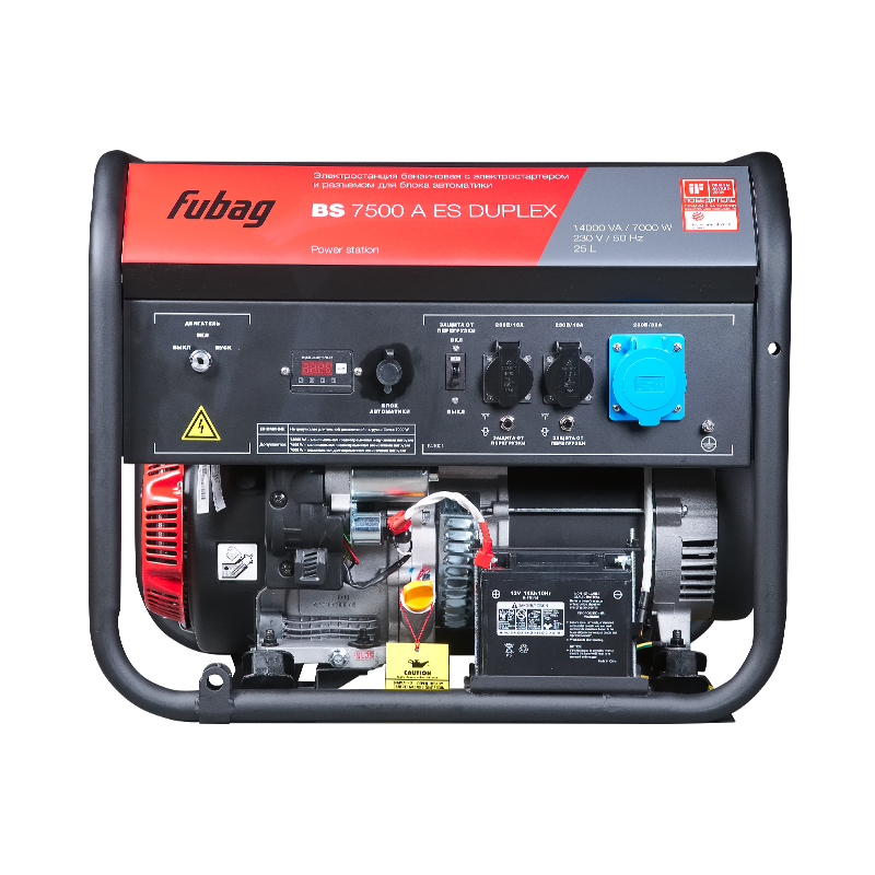 Легкий запуск бензогенератора Fubag BS 7500 A ES DUPLEX обеспечивает электростартер. Аккумулятор входит в комплект поставки. Предусмотрена возможность подключения блока автоматики к генератору BS 7500 A ES DUPLEX для организации электроснабжения в автоматическом режиме (опция). Управление заслонкой карбюратора и топливного крана происходит в автоматическом режиме, в случае необходимости предусмотрено ручное управление. Панель управления оснащена тремя пыле/влагозащищенными розетками: 2 х 220В/16А и 1 х 220В/32А для подключения мощных потребителей. На розетки бензогенератора установлена индивидуальная защита от короткого замыкания и перегрузки.