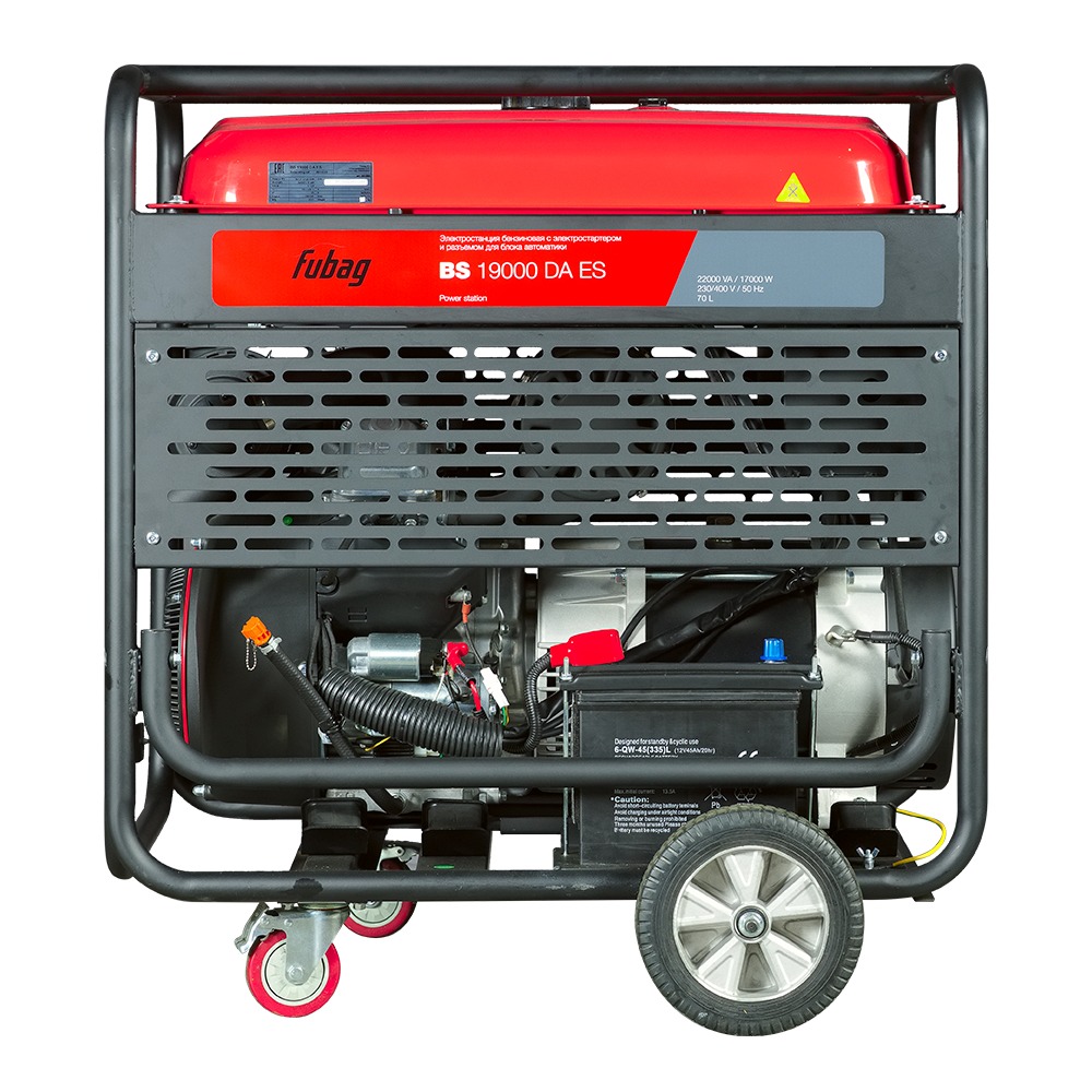 BS 19000 DA ES – трехфазный бензиновый генератор с электростартером. Электростанция способна обеспечивать электроснабжением частные владения, строительные площадки или небольшое производство. Высокий ресурс работы станции обеспечат профессиональный V-образный 2-х цилиндровый OHV-двигатель FUBAG. Синхронный альтернатор с медными обмотками ротора и статора оснащен системой регулировки выходного напряжения (AVR), который гарантирует стабильное выходное напряжение и частоту тока.