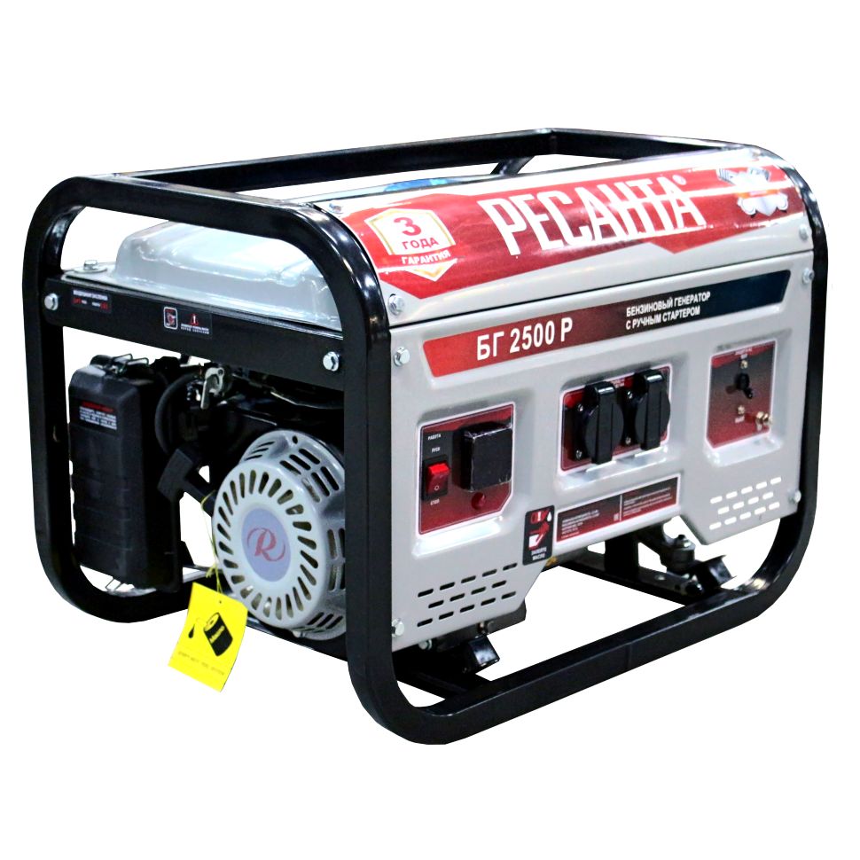 Электрогенератор бензиновый (бензогенератор) — электрическая машина, предназначенная для автономного электроснабжения в повторнократковременном режиме потребителей бытового и аналогичного назначения, относящихся к классу переносных электроприемников. В качестве первичного двигателя используется карбюраторный двигатель, топливом для которого является неэтилированный бензин. В условиях временного или постоянного отсутствия электроэнергии обеспечить питание электрооборудования можно с помощью генератора РЕСАНТА модели БГ 2500 Р. Несмотря на компактные габариты и относительно небольшой вес, бензогенератор демонстрирует высокий КПД и хорошие показатели мощности. Генератор РЕСАНТА БГ 2500 Р имеет увеличенный ресурс двигателя, медную обмотку альтернатора. Оснащен многофункциональным цифровым дисплеем с индикацией величины напряжения, частоты тока и счетчиком моточасов. Агрегат оснащен надежным одноцилиндровым двигателем, который работает на неэтилированном бензине. Сфера применения установки включает в себя, как коммерческие объекты (магазины, ларьки, офисы), так и загородные дома, дачи, подсобные хозяйства. При покупке бензинового генератора Ресанта БГ 2500 Р, Вы останетесь довольны его прекрасной производительностью и компактным внешним видом.