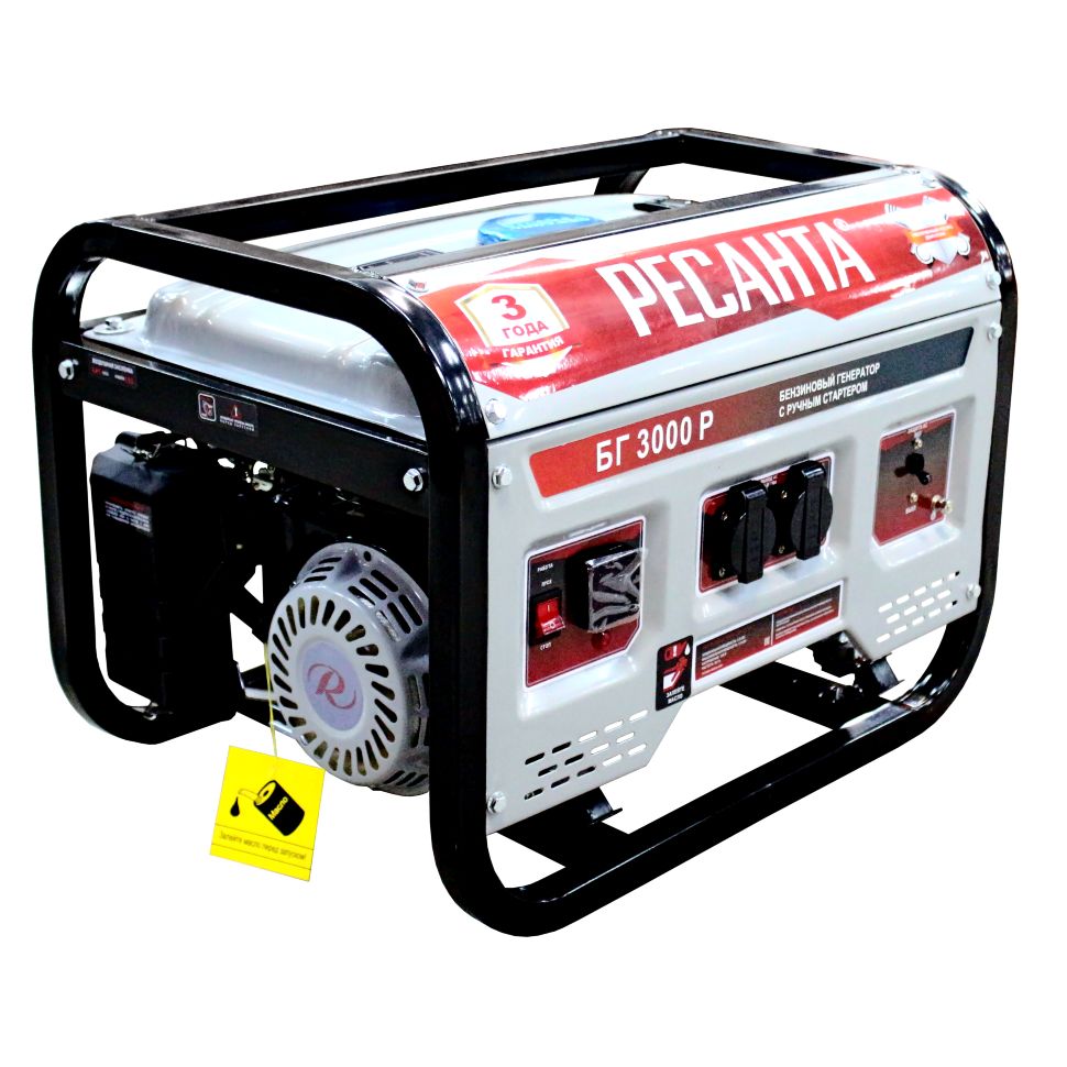 Электрогенератор бензиновый (бензогенератор) — электрическая машина, предназначенная для автономного электроснабжения в повторнократковременном режиме потребителей бытового и аналогичного назначения, относящихся к классу переносных электроприемников. В качестве первичного двигателя используется карбюраторный двигатель, топливом для которого является неэтилированный бензин. В условиях временного или постоянного отсутствия электроэнергии обеспечить питание электрооборудования можно с помощью генератора РЕСАНТА модели БГ 3000 Р. Несмотря на компактные габариты и относительно небольшой вес, бензогенератор демонстрирует высокий КПД и хорошие показатели мощности. Генератор РЕСАНТА БГ 3000 Р имеет увеличенный ресурс двигателя, медную обмотку альтернатора. Оснащен многофункциональным цифровым дисплеем с индикацией величины напряжения, частоты тока и счетчиком моточасов. Агрегат оснащен надежным одноцилиндровым двигателем, который работает на неэтилированном бензине. Сфера применения установки включает в себя, как коммерческие объекты (магазины, ларьки, офисы), так и загородные дома, дачи, подсобные хозяйства. При покупке бензинового генератора Ресанта БГ 3000 Р, Вы останетесь довольны его прекрасной производительностью и компактным внешним видом.