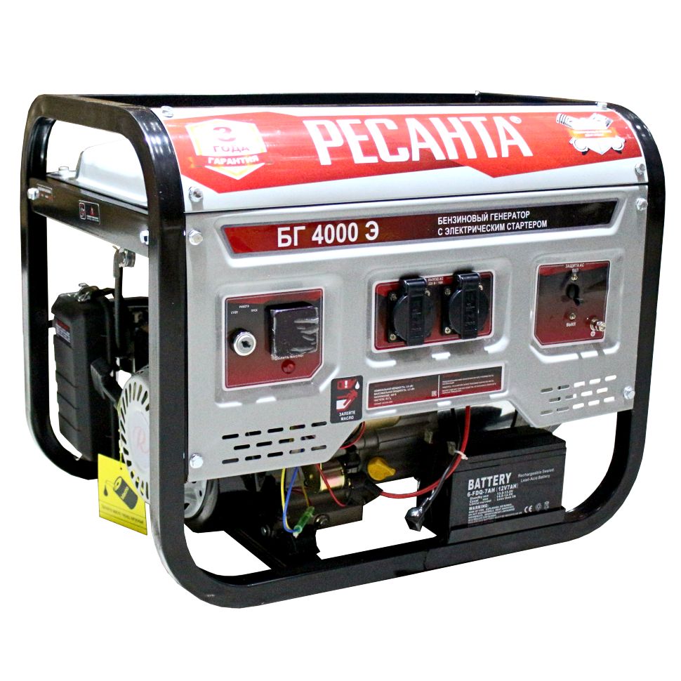 Электрогенератор бензиновый (бензогенератор) — электрическая машина, предназначенная для автономного электроснабжения в повторнократковременном режиме потребителей бытового и аналогичного назначения, относящихся к классу переносных электроприемников. В качестве первичного двигателя используется карбюраторный двигатель, топливом для которого является неэтилированный бензин. В условиях временного или постоянного отсутствия электроэнергии обеспечить питание электрооборудования можно с помощью генератора РЕСАНТА модели БГ 4000 Э. Несмотря на компактные габариты и относительно небольшой вес, бензогенератор демонстрирует высокий КПД и хорошие показатели мощности. Генератор РЕСАНТА БГ 4000 Э имеет увеличенный ресурс двигателя, медную обмотку альтернатора. Оснащен многофункциональным цифровым дисплеем с индикацией величины напряжения, частоты тока и счетчиком моточасов. Агрегат оснащен надежным одноцилиндровым двигателем, который работает на неэтилированном бензине. Сфера применения установки включает в себя, как коммерческие объекты (магазины, ларьки, офисы), так и загородные дома, дачи, подсобные хозяйства. При покупке бензинового генератора Ресанта БГ 4000 Э, Вы останетесь довольны его прекрасной производительностью и компактным внешним видом.