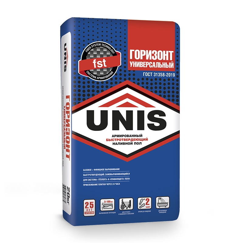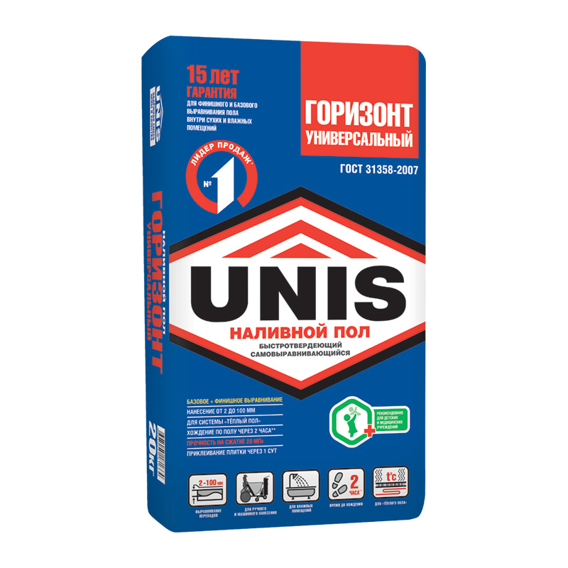 Наливной пол Unis Горизонт предназначен для ручного и машинного выравнивания бетонных полов, цементных стяжек на несущих основаниях и устранения перепадов (от 3 до 100 мм) под последующую укладку напольных покрытий (линолеума, ковролина, керамической плитки, ламината, паркета и паркетной доски и др.). Рекомендуется для систем «Тёплый пол» и «Плавающий пол». Для жилых, бытовых и административных отапливаемых помещений с умеренной и повышенной влажностью (кухни и ванные комнаты) с невысокими механическими нагрузками. Дополнительно усилен армирующими волокнами, что снижает риск образования трещин и усадки наливного пола.
