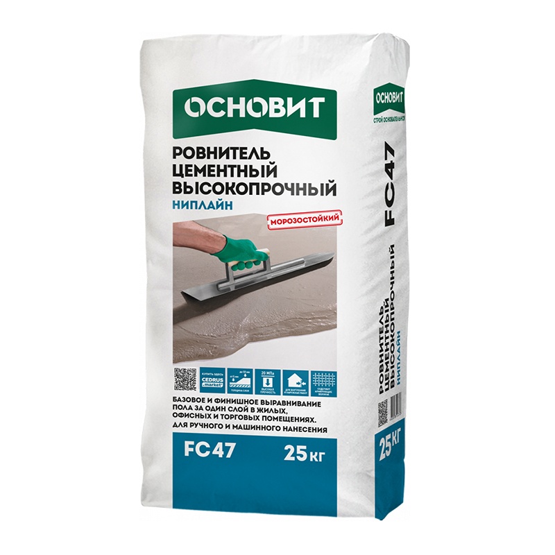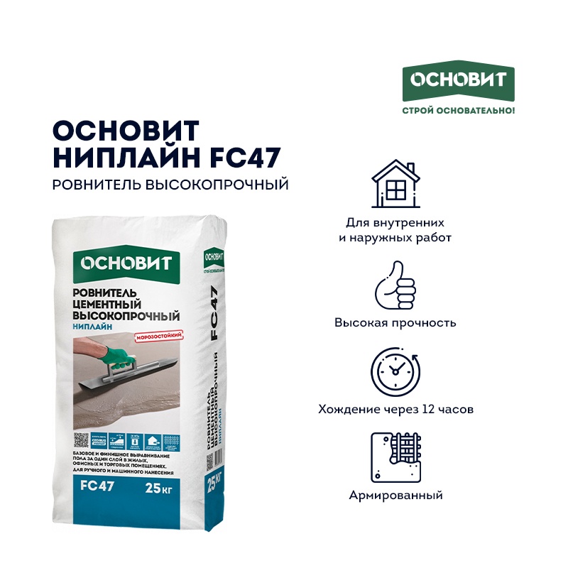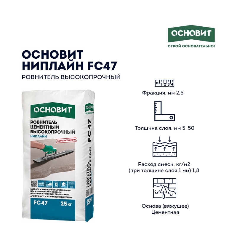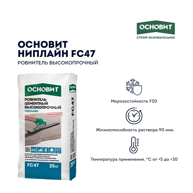 Предназначен для выравнивания оснований (слоем от 5 до 50 мм) и устройства прочного пола в жилых, офисных, торговых и общественных помещениях. Рекомендуется для заделки неровностей до 80 мм. Может применяться в качестве основания под укладку керамической и каменной плитки, наливных полимерных покрытий, под окрашивание. Под укладку линолеума, паркета, ламината, ковролина, деревянных полов и пробковых покрытий при необходимости поверхность рекомендуется дополнительно выровнять наливными полами Основит. Рекомендуется для устройства всех видов стяжек, в том числе «плавающих», стяжек на разделительном слое, укрытия трубопроводов. Применяется в системе «Теплый пол». Для внутренних и наружных работ. Не эксплуатировать без покрытия. Рекомендуемые основания — бетонные и цементно-песчаные основания.