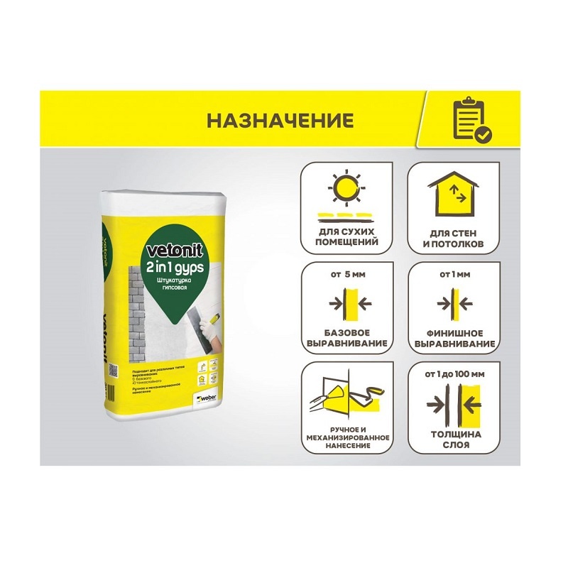 Предназначена для различных типов выравнивания: базового и тонкослойного, стен и потолков, ручным и механизированным способом в сухих помещениях с нормальной влажностью, а также на кухне, в коридоре, сан. узлах.
