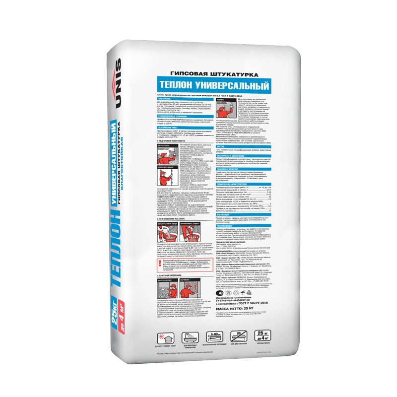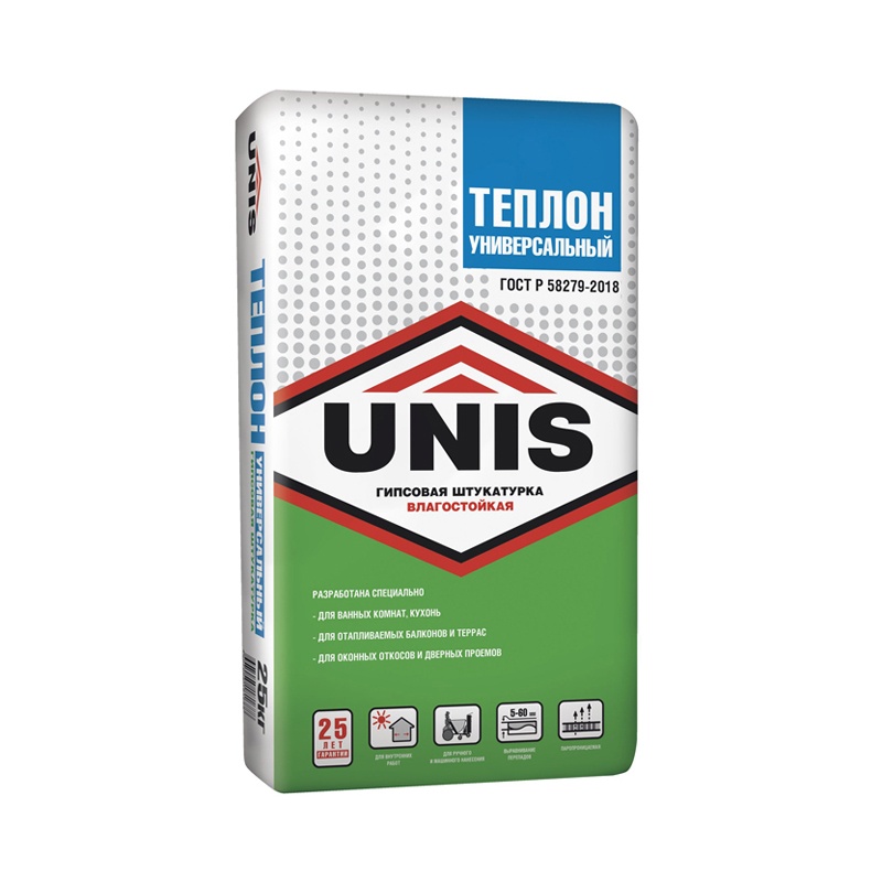 Штукатурка гипсовая влагостойкая Unis Теплон универсальный применяется для выравнивания стен: сплошного (от 5 до 40 мм) и частичного (до 60 мм), выравнивания потолков (до 20 мм) внутри помещений с умеренной и повышенной влажностью под последующую отделку (оклейку обоями, окрашивание, облицовку плиткой и пр.). Используется для ручного и машинного нанесения.