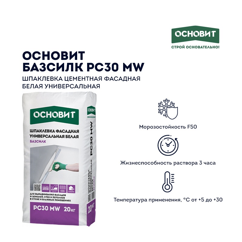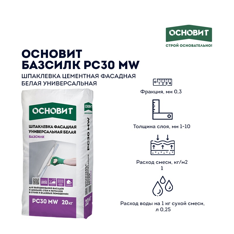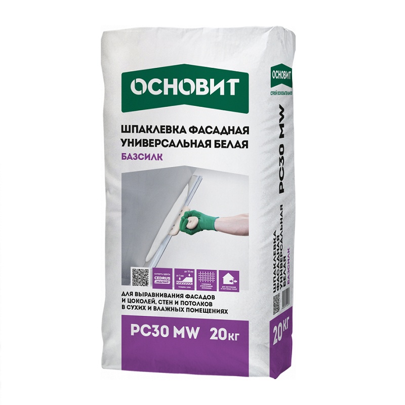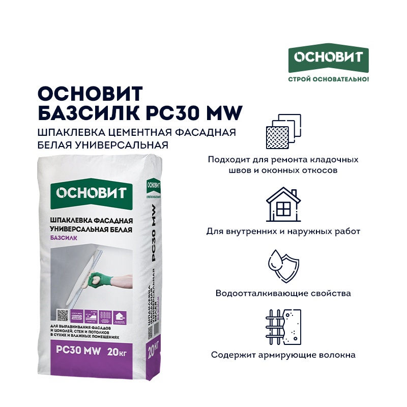 Предназначена для внутренних и наружных работ для выравнивания стен и потолков в сухих и влажных помещениях, фасадов, цоколей. Подходит для ремонта кладочных швов и оконных откосов, для локальных ремонтных работ. Рекомендуется под последующее нанесение декоративных покрытий. Содержит армирующие волокна. Рекомендуемые основания — бетонные, кирпичные основания, ячеистые бетоны, цементные штукатурки, ГКЛ, ГВЛ, ЦСП. Имеет белый цвет и обладает водооталкивающими свойствами.