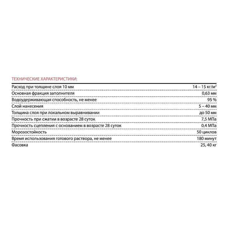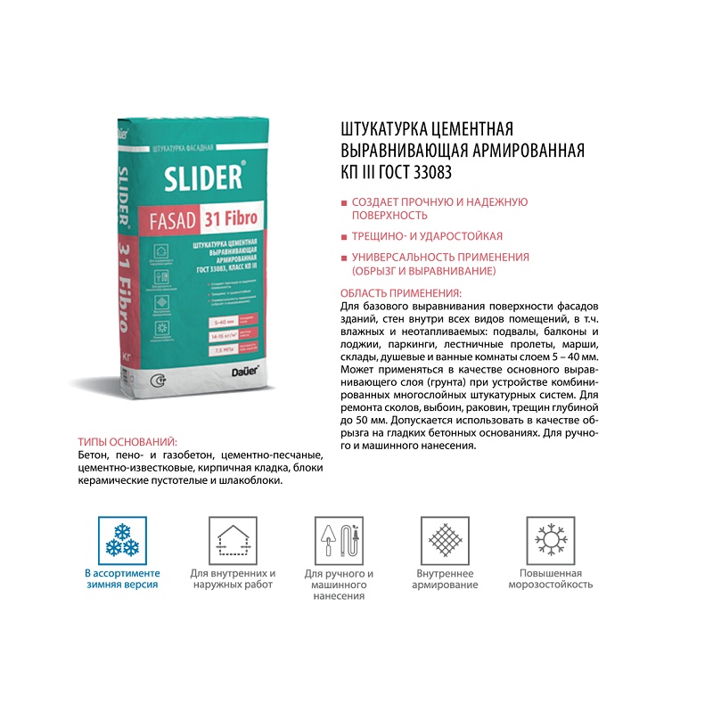 Предназначена для ручного и механизированного выравнивания (слоем 5 — 40 мм) поверхности фасадов, стен внутри всех видов помещений, в т.ч. влажных и неотапливаемых: подвалы, балконы и лоджии, паркинги, лестничные пролеты, марши, склады, душевые и ванные комнаты. Для ремонта сколов, выбоин, раковин, трещин глубиной до 50 мм. Допускается использовать в качестве обрызга на гладких бетонных основаниях.