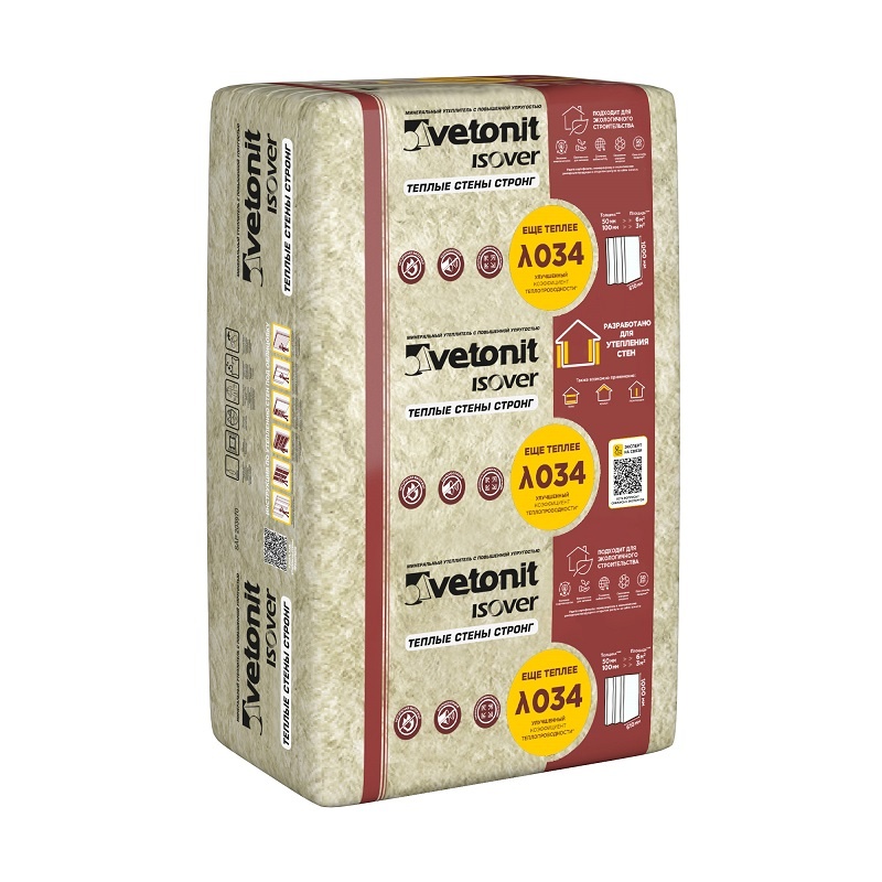 Тепло- и шумоизоляционные плиты Ветонит Теплые Стены Стронг с повышенной упругостью и низкой теплопроводностью предназначены для внешних и внутренних стен. Утеплитель не ломается при монтаже и надежно держится в каркасе без крепежа.