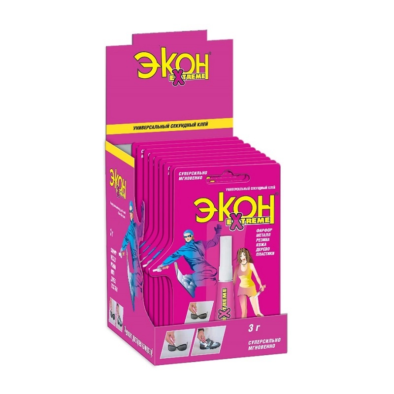 Предназначены для ремонта различных предметов в считанные секунды. Клей хорошо растекается, заполняет мельчайшие трещины. Формула нового секундного клея ЭКОН обеспечивает мгновенное соединение материалов, которое сохраняет свою прочность в течение длительного времени. Предназначен для всех видов быстрых ремонтных работ в быту. Мгновенно склеивает фарфор, керамику, металл, резину, кожу, дерево, бумагу, пластики, пробку в различных сочетаниях, кроме посуды, контактирующей с пищей.