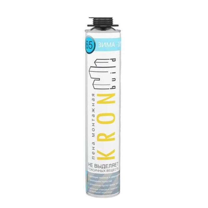Пена монтажная торгового бренда KRONbuild Зима Standart 65, применяется при проведении строительно-монтажных работ, обеспечения дополнительной тепло- и звукоизоляции, заполнении дефектов и трещин, заполнения мест и пустот около труб отопительной и водопроводной системы, оконных и дверных конструкций.