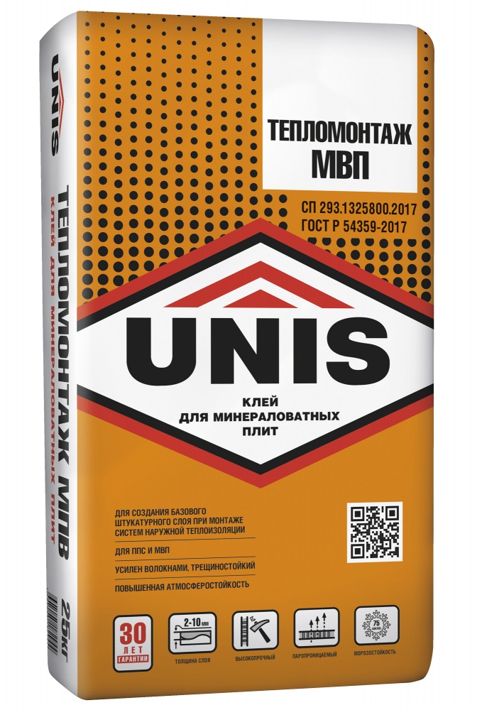 Для крепления минеральноватных теплоизоляционных плит. Для внутренних и наружных работ на объектах индивидуального жилого строительства. Для создания на поверхности теплоизоляционных пенополистирольных плит базового штукатурного слоя (с использованием фасадной стеклосетки) следует применять UNIS Теплофасад или UNIS Теплофасад S.