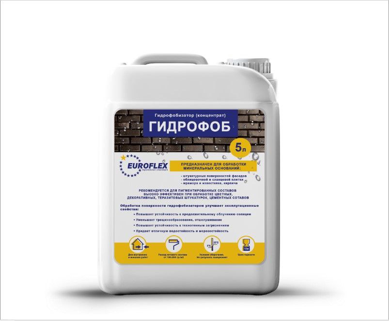 В зависимости от способа нанесения придает матовый или глянцевый вид покрытию. Обработанная поверхность гидрофобизатором стабилна к ультрафиолетовому воздействию и придает отличную водостойкость субстрату, уменьшая тем самым трещинообразование, отшелушивание, химическую деградацию, появление высолов, рост микроорганизмов,
