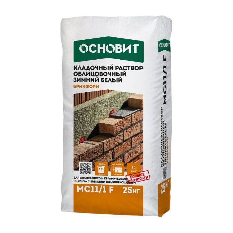 Кладочный раствор ОСНОВИТ БРИКФОРМ МС11/1 F зимний предназначен для кладки стен и перегородок из облицовочного кирпича водопоглощением более 12% с возможностью расшивки швов в момент укладки при температуре окружающей среды и основания от -10 до + 10°С.