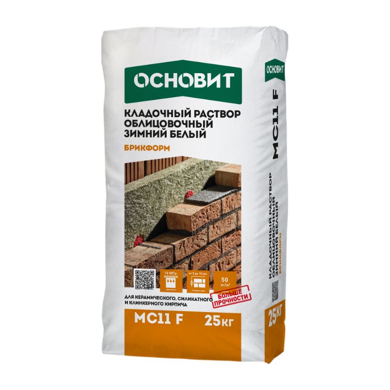 Кладочный раствор ОСНОВИТ БРИКФОРМ МС11 F зимний предназначен для кладки стен из облицовочного кирпича с водопоглощением до 12% с возможностью расшивки швов в момент укладки при температуре окружающей среды и основания от -10 до + 10°С.