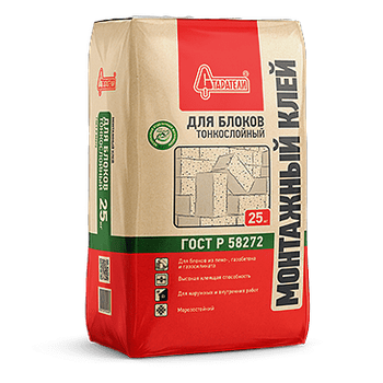 ГОСТ Р 58272 Для кладки стен в малоэтажном строительстве, возведения перегородок и ограждений из пазовых и беспазовых блоков и плит на основе ячеистого бетона, газосиликата, легких заполнителей. Тонкослойная кладка предотвращает появление термических мостиков и гарантирует одинаковые параметры тепловой изоляции всей конструкции. Допускается использование материала для шпатлевания поверхности блоков слоем от 2 до 5 мм. Применяется для наружных и внутренних работ.