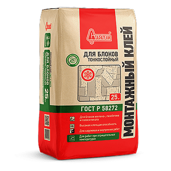 ГОСТ Р 58272 Для кладки стен в малоэтажном строительстве, возведения перегородок и ограждений из пазовых и беспазовых блоков и плит на основе ячеистого бетона, газосиликата, легких заполнителей. Тонкослойная кладка предотвращает появление термических мостиков и гарантирует одинаковые параметры тепловой изоляции всей конструкции. Допускается использование материала для шпатлевания поверхности блоков слоем от 2 до 5 мм. Применяется при температуре окружающей среды от — 10 до + 25°С.