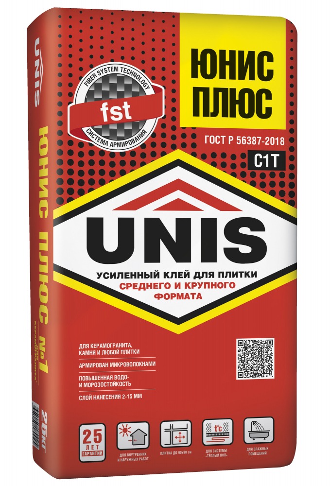 Усиленный клеевой состав для укладки любых видов керамической плитки, клинкерной плитки, плит из природного и искусственного камня, керамогранита среднего и крупного формата (до 90х90 см) на стены и полы в любых помещениях: влажных, сухих, промерзающих и отапливаемых. Клей также подходит для наружных работ, облицовки фасадов и цоколей зданий. «ЮНИС ПЛЮС» рекомендуется для сложных задач: для системы «Тёплый пол», для крепления керамогранита на фасад, укладки поверх старой плитки («плитка на плитку»).