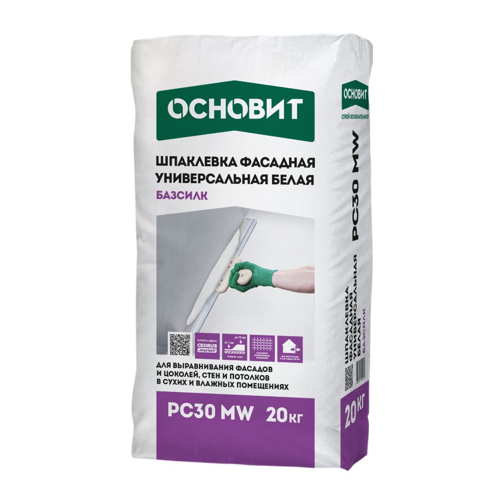 Шпаклевка ОСНОВИТ БАЗСИЛК PC30 MW предназначена для выравнивания стен и потолков в сухих и влажных помещениях, фасадов, цоколей.