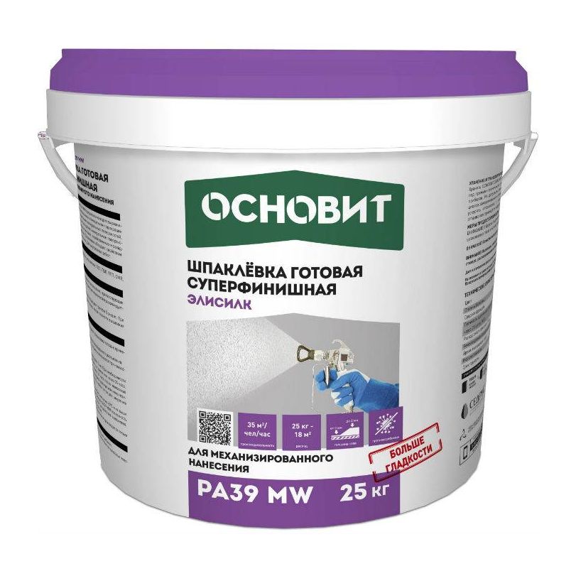 Шпаклевка готовая суперфинишная для механизированного нанесения Основит Элисилк РА39 MW предназначена для выравнивания стен и потолков в сухих и влажных отапливаемых, с переменным отоплением и неотапливаемых помещениях под окрашивание, нанесение венецианской штукатурки, оклеивание обоями.
