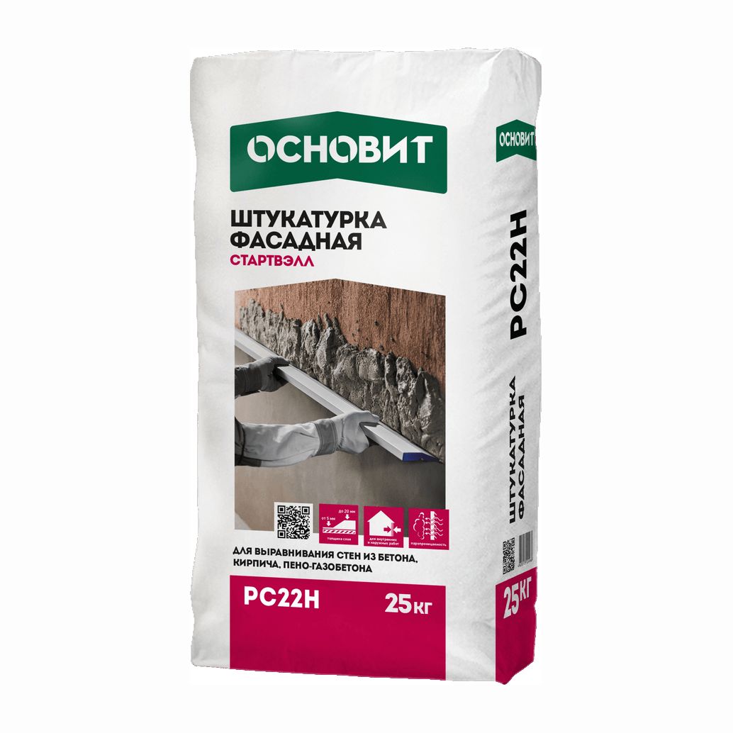 Цементная штукатурка ОСНОВИТ СТАРТВЭЛЛ РС22 Н предназначена для выравнивания стен из бетона, кирпича и ячеистого бетона.