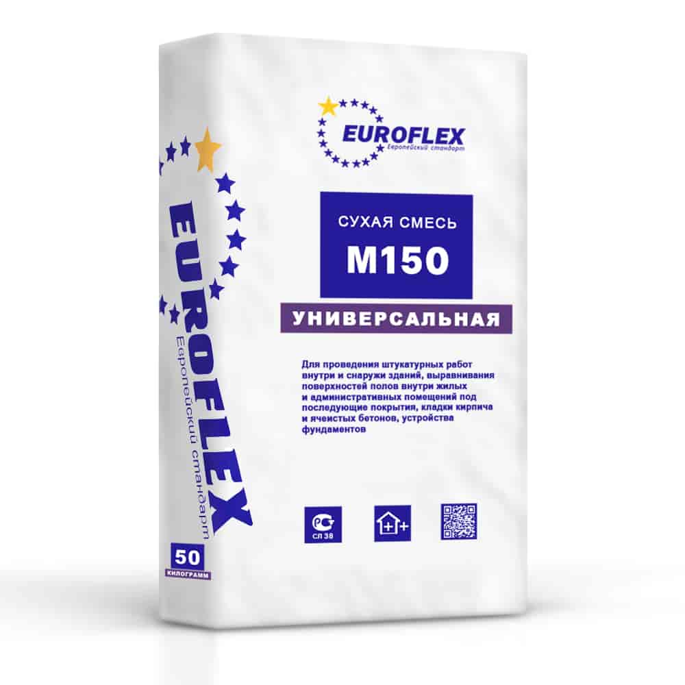 Сухая смесь EUROFLEX М-150 применяется для оштукатуривания больших и малых площадей, кладки стен и перегородок из кирпича и других мелкоштучных элементов, стяжки полов вручную и т.п. Смесь EUROFLEX М-150 изготовлена из высококачественного цемента, обогащенного речного и карьерного песка, с применением специальных добавок, улучшающих свойства продукта. Для наружных и внутренних работ