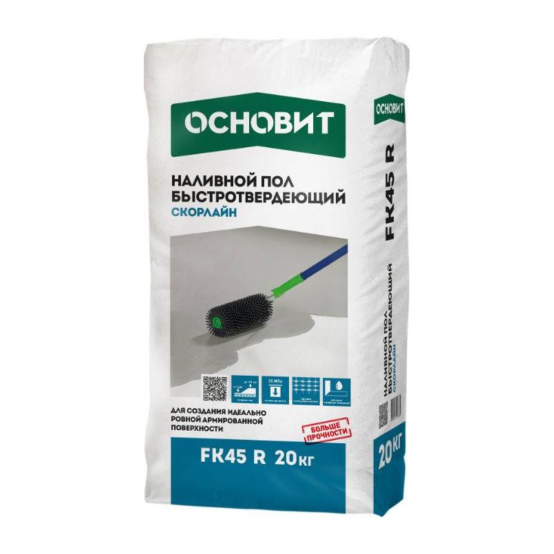 Наливной пол Основит Скорлайн FK45 R предназначен для предварительного и окончательного выравнивания оснований слоем от 2 до 100 мм в жилых и офисных помещениях.