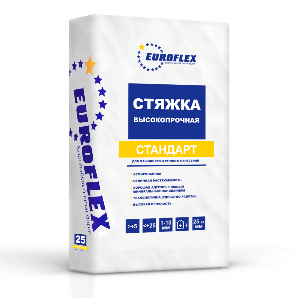 Стяжка высокопрочная EUROFLEX® предназначена для предварительного выравнивания горизонтальных оснований, создания прочного и ровного пола под укладку керамической и керамогранитной плитки, натурального камня любых форматов, нанесение финишных наливных полимерных покрытий, окрашивание. Перед укладкой других декоративных материалов (линолеума, ковролина, ламината, паркета, пробковых покрытий) на стяжку рекомендуется нанести финишный слой наливного пола EUROFLEX®. Материал может использоваться для устройства “плавающих” полов, а также для придания поверхности требуемого уклона. Рекомендуется для применения в системе “теплый пол”. Применяется для внутренних и наружных работ. Используется для механизированного и ручного нанесения.