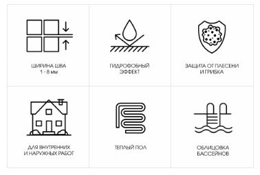 Обладает гидрофобным эффектом, препятствующим загрязнению и образованию пятен. Благодаря активным компонентам обеспечивает максимальную защиту швов от возникновения грибков, плесени и водорослей, предотвращая их распространение. Для наружных и внутренних работ.