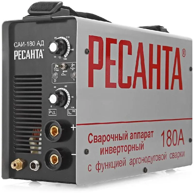 Сварочный аппарат РЕСАНТА САИ-180 АД — портативный инверторный сварочный аппарат с функцией аргонодуговой сварки. Это универсальный агрегат, который используется для сварки металлических конструкций вольфрамовым электродом (TIG), а также сварки электродами с рутиловым покрытием (MMA). Есть регулировка времени убывания тока и силы дуги в режиме ММА.