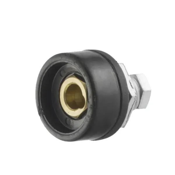 Гнездо серии СКРП 10-25 рассчитано на максимальный ток нагрузки 200 А. Материал контакта изготовлен из высококачественного медного сплава, плюс особая конструкция гнезда, обеспечивающая надежную фиксацию ответной вставки, полностью исключают искрообразование и нагрев места соединения. Специальная канавка под фиксатор гарантирует прочность крепления штыревой вилки в посадочном отверстие гнезда. Крепление к панели осуществляется при помощи фиксирующей гайки, для кабеля питания предназначен винтовой зажим.