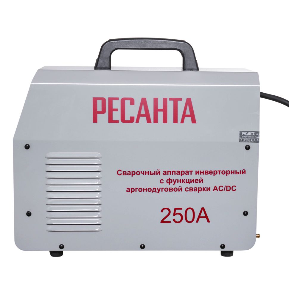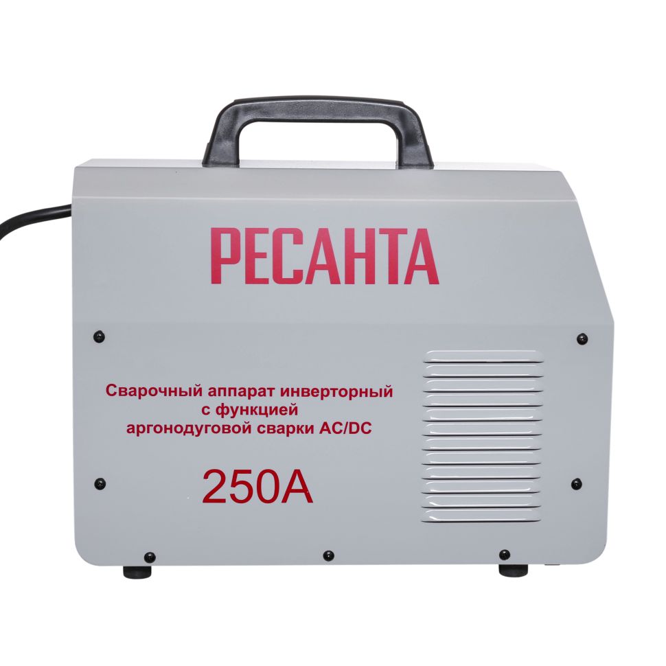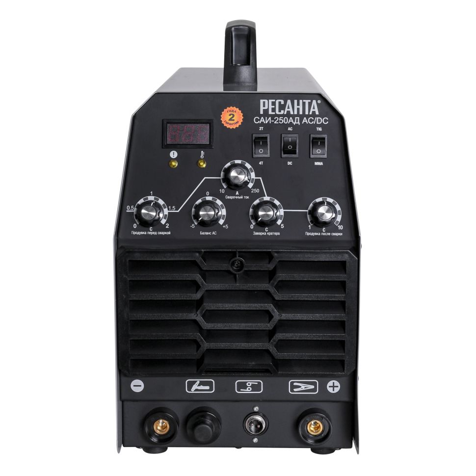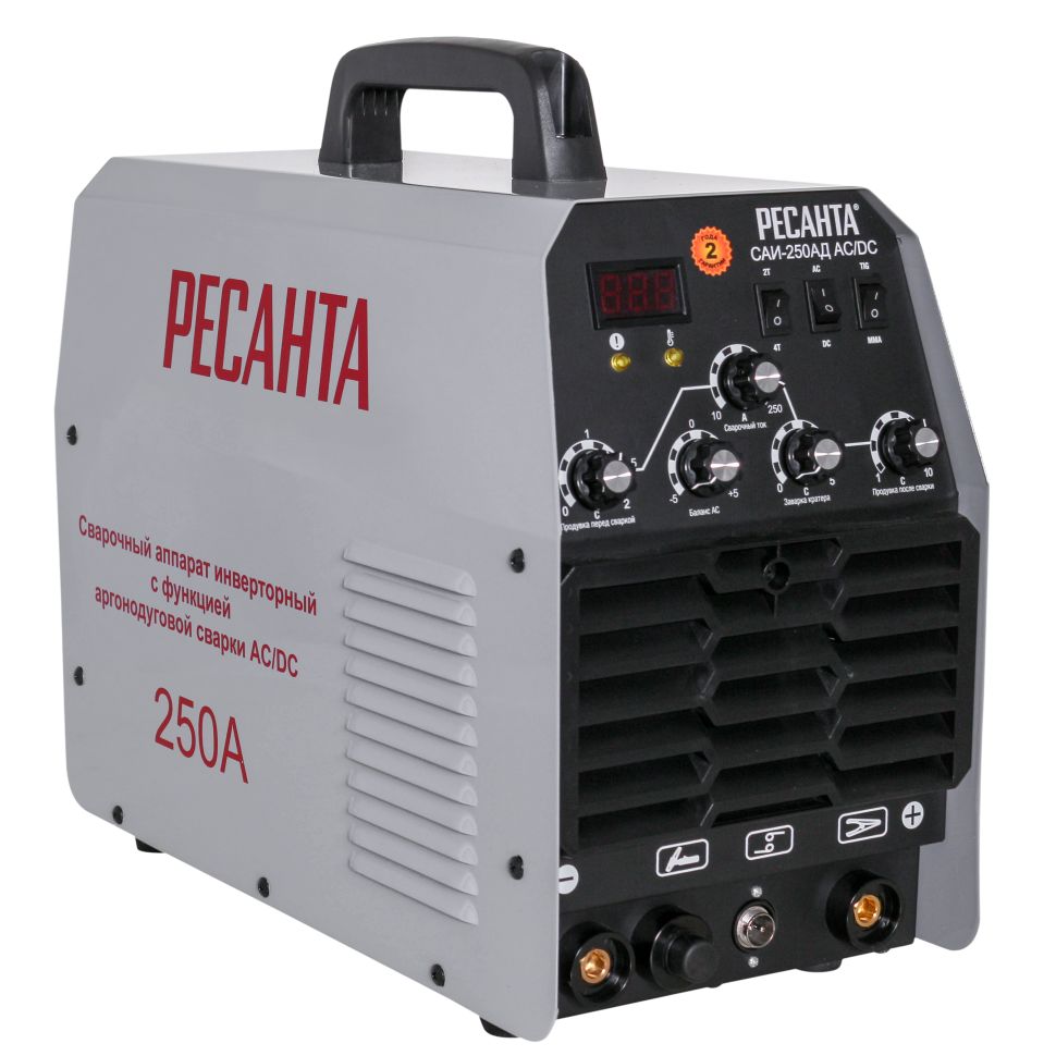 Сварочный аппарат РЕСАНТА САИ-250АД AC/DC — современная инверторная аргонодуговая установка, позволяющая работать как на постоянном (сварка черных и нержавеющих сталей, меди, титана и пр.), так и на переменном токе (сплавы алюминия, магния, медные сплавы больших толщин и пр.), где требуется удаление окислов со свариваемой поверхности в режиме TIG, а также возможна сварка ММА покрытым электродом (рутиловым и основным покрытием).Режим ММА – режим ручной дуговой сварки покрытым электродом.