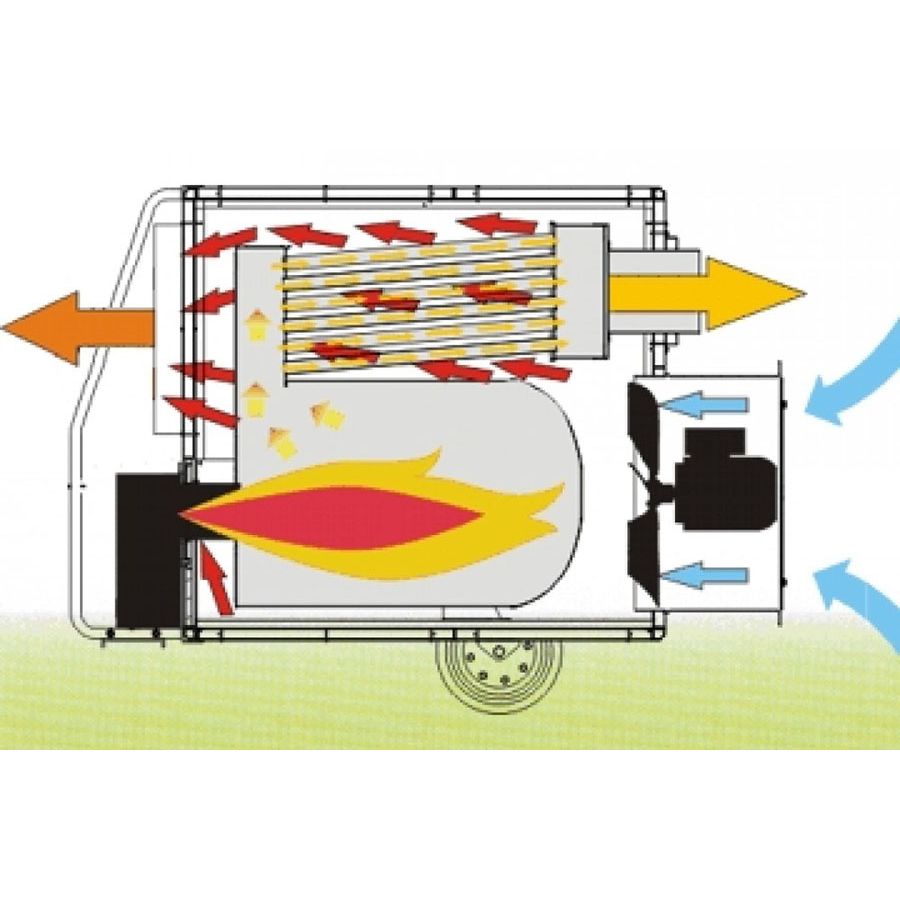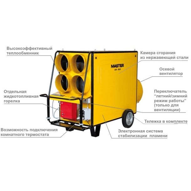 Корпус агрегата изготовлен из высокопрочных материалов, не меняющих свои свойства при длительном воздействии высоких температур. Специальные отводы предусматривают присоединение гибких шлангов для вывода продуктов горения. При необходимости модель может работать в режиме вентиляции без нагрева воздуха. Камера сгорания выполнена из нержавеющей стали, что обеспечивает долговечность эксплуатации. Для быстрой транспортировки в комплект входит тележка, а термостат можно перезапускать в ручном режиме. Для обеспечения безопасной эксплуатации в помещениях с обслуживающим персоналом необходимо постоянно осуществлять проветривание помещения для притока свежего воздуха.