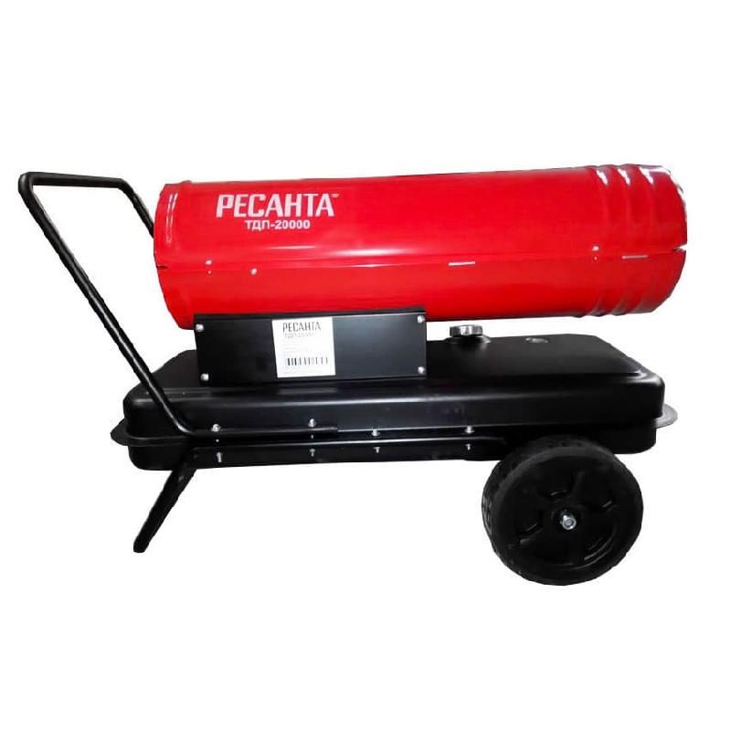 В дизельной тепловой пушке Ресанта ТДП-20000 используется прямой способ нагрева, при котором отработанные газы поступают непосредственно в отапливаемое помещение. Поэтому она используется только в нежилых помещениях — складах, строительных объектах, сельхоз хранилищах различного назначения и т. д. Устройство обеспечивает быстрый и эффективный прогрев воздуха. Внутренние элементы прибора защищены прочным металлическим корпусом круглой формы. Устойчивость конструкции обеспечивается широким опорным основанием и надежной подставкой. Для удобства перемещения служат колеса и удобная ручка.