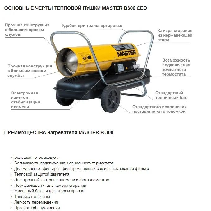 Уникальность данной модели заключаются в долговечности. Покрытие корпуса имеет высокую устойчивость к перепадам температуры, обеспечивает защиту от износа, не нагревается во время эксплуатации. Агрегат весит 28 кг и оснащен ручкой для переноса, что позволяет с легкостью осуществлять транспортировку. Также, для удобства перемещения, в опорной части корпуса расположена тележка. Тепловая пушка Master B 150 CED имеет такие преимущества, как быстрый нагрев, бесшумность, система контроля пламени, компактные габариты.