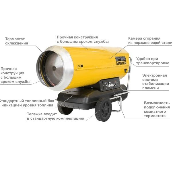 Тепловая пушка Master B 360 представляет собой мощный обогревательный прибор, который может работать как на керосине, так и на дизельном топливе. Ее использование рекомендовано в зданиях с хорошей вентиляцией. Она представляет собой обогреватель прямого нагрева, обладающий термостойким корпусом. На корпусе имеется датчик, позволяющий отслеживать уровень топлива. В нагревательный элемент интегрирована система мониторинга пламени. К оборудованию можно подсоединить термостат, чтобы поддерживать желаемую температуру.
