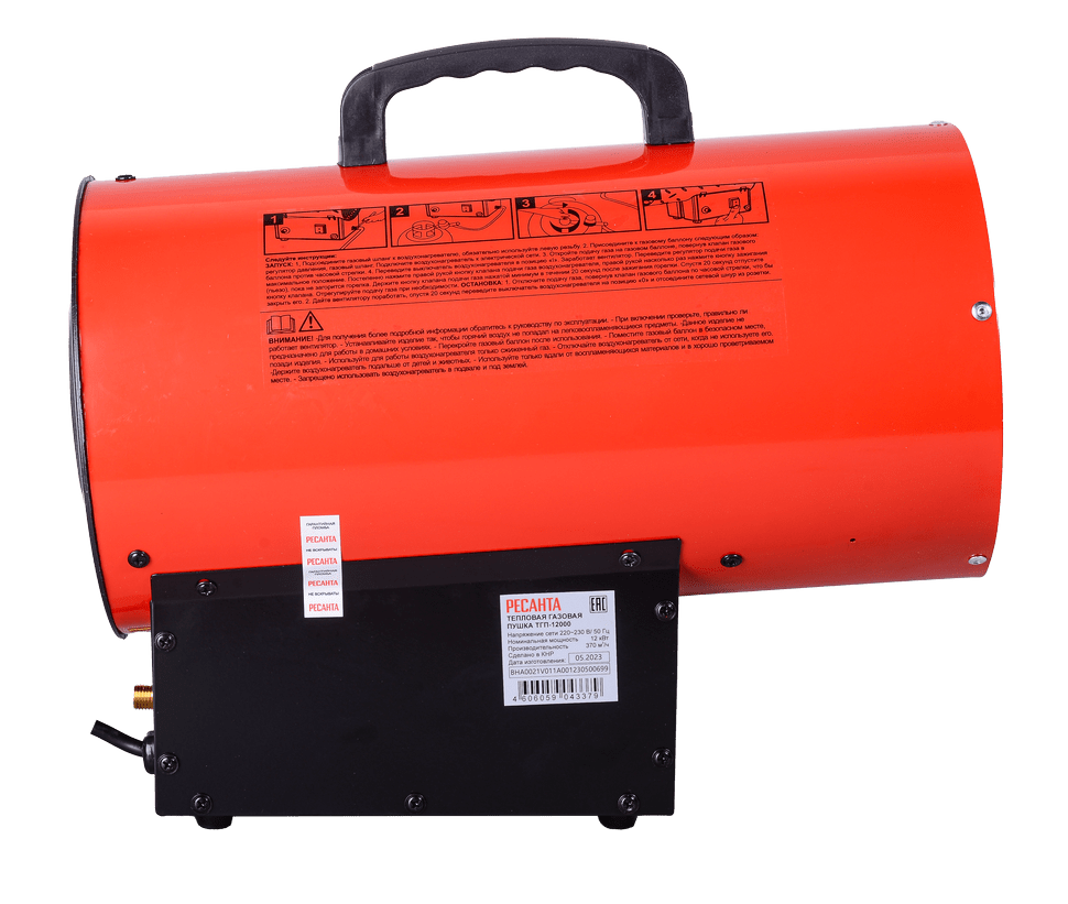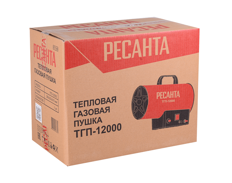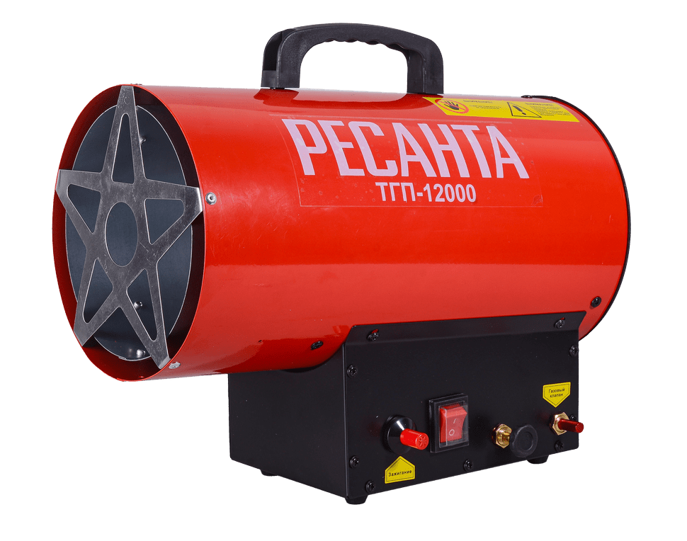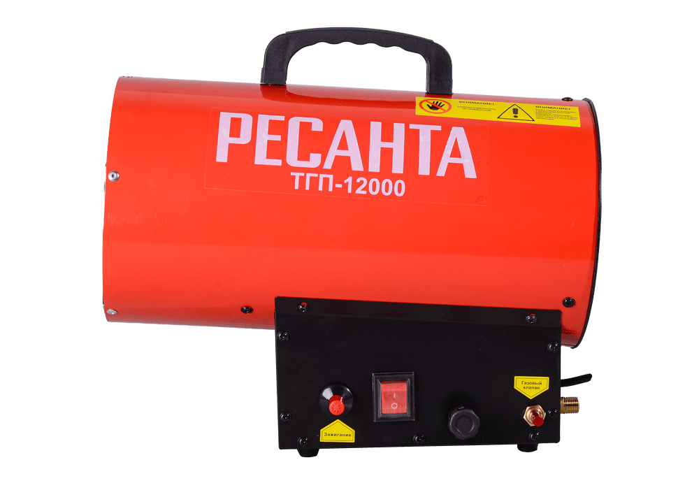 Газовая тепловая пушка Ресанта ТГП-12000 — эффективный нагреватель воздуха, использующий в качестве топлива сжиженные газы: пропан, пропан-бутан, бутан. Применяется для обогрева складских помещений, цехов, ремонтных мастерских площадью до 120 м², а также при монтаже натяжных потолков, для просушки окрашенных стен и штукатурки. Тепловая мощность имеет диапазон 7-12 кВт. Двигатель обеспечивает воздушный поток производительностью 370 м³/час.