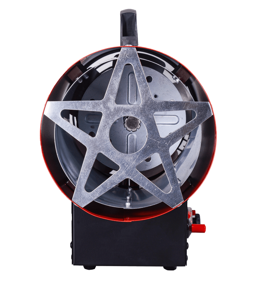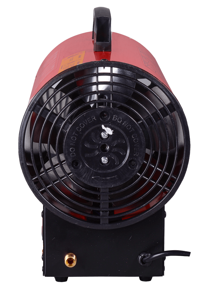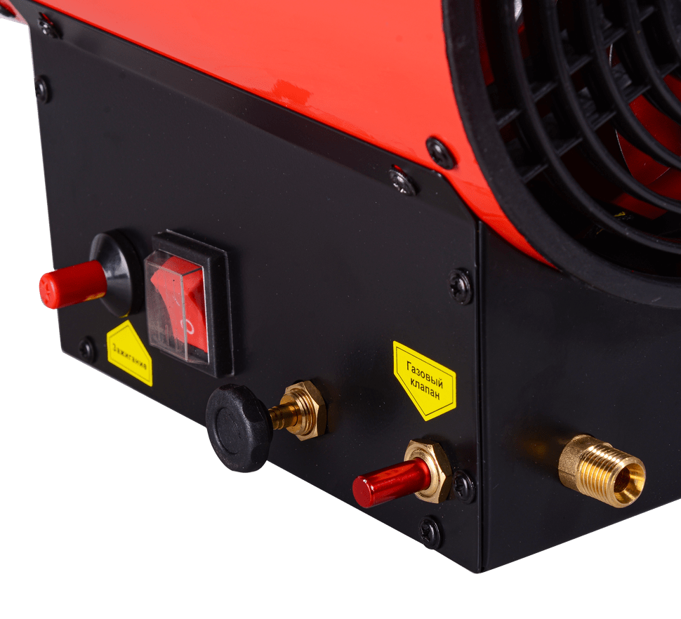 Сжиженный газ создает высокую температуру в камере сгорания тепловой пушки. Электрическая энергия однофазной сети необходима для работы вентилятора и функционирования автоматических узлов. Зажигание осуществляется с помощью пьезоэлектрического элемента. Теплопушка отличается экономичным расходом топлива 0,6-0,9 кг/час. Подача газа осуществляется под давлением 0,7 Бар. Контроль пламени происходит с помощью термодатчика из биметалла. Для обеспечения пожарной безопасности предусмотрена система защиты от перегрева. При отсоединении газового шланга тепловая пушка выполняет функцию вентилятора.