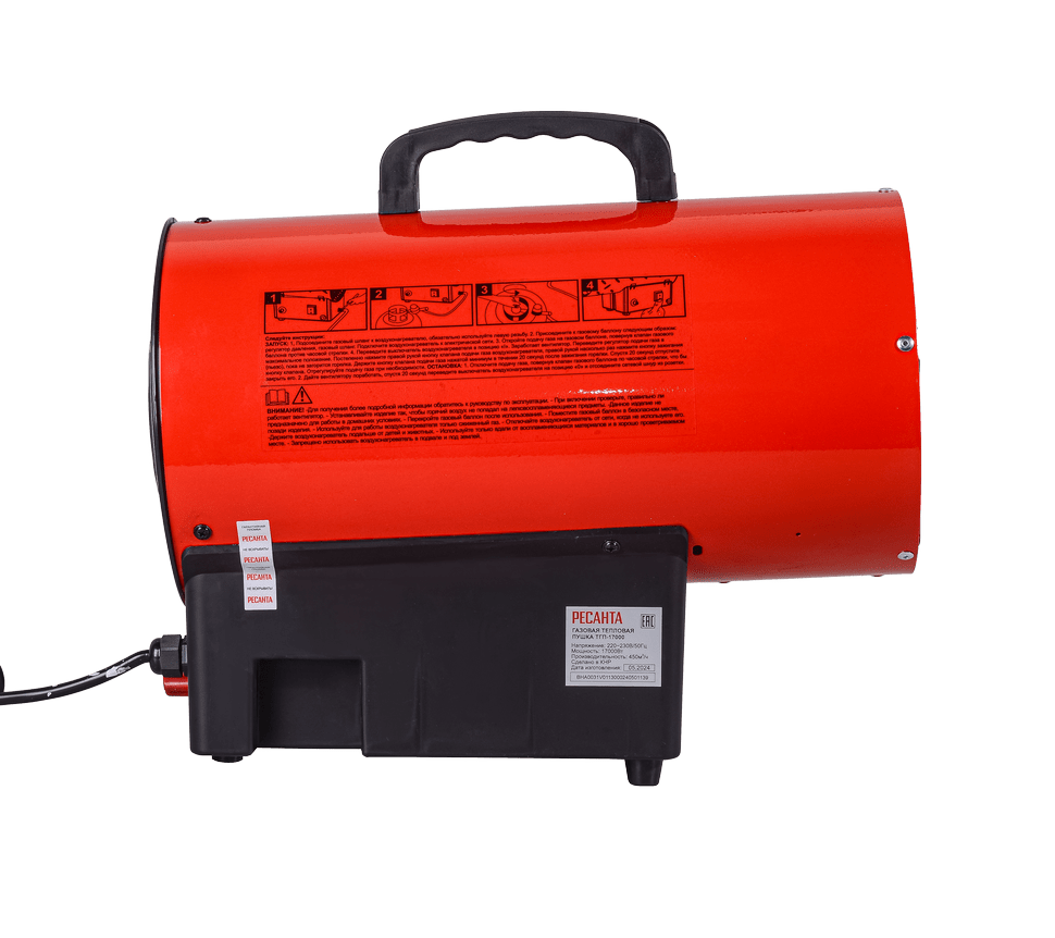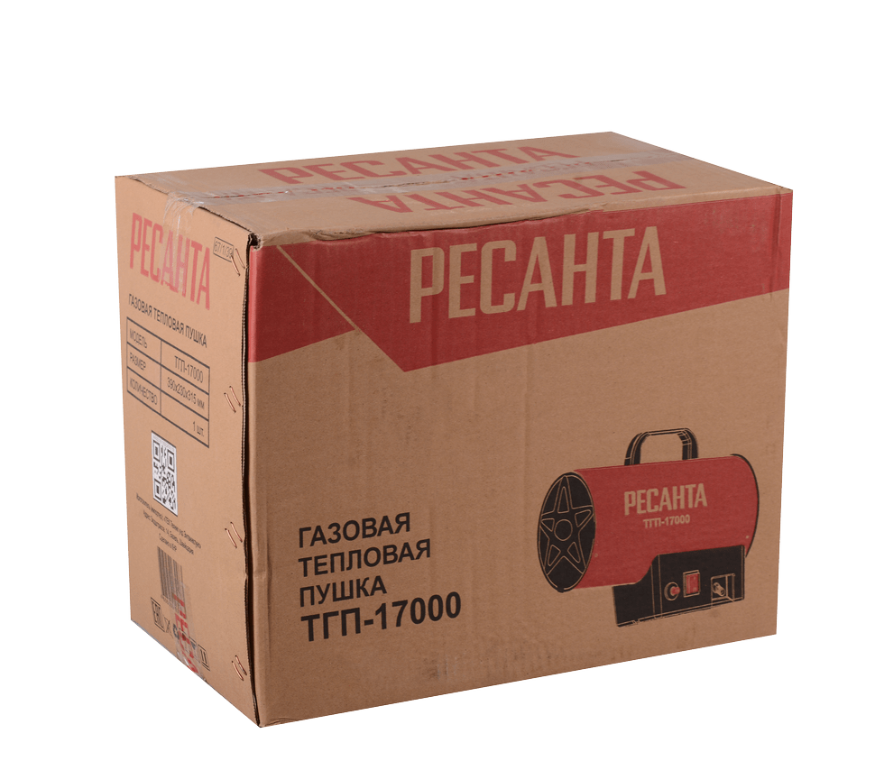 Благодаря встроенной системе защиты от перегрева прибор Ресанта ТГП-17000 полностью безопасен при длительном использовании. Пушка также оснащена регулятором подачи топлива и специальной системой, препятствующей угасанию огня. Благодаря такой конструкции исключается утечка топлива. Тепловая пушка на газовом топливе обладает простой конструкцией, за счёт чего удобна в использовании. Однако она не подходит для установки в жилых помещениях. Теплопушка поставляется в комплекте с ручкой, газовым шлангом и регулятором давления.