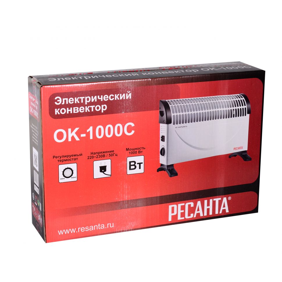 Электрический конвектор РЕСАНТА ОК-1000С для обогрева помещений. Состоит из нагревательной части, заключенной в нижней части корпуса со щелеобразными отверстиями снизу и жалюзи в верхней части. Данная конструкция даёт возможность воздуху беспрепятственно проходить внутри конвектора, Модели конвекторов Ресанта серии СОтличием данной серии конвекторов от остальных серий является вид используемого нагревательного элемента (СТИЧ). При аналогичной мощности СТИЧ элемент меньше и легче ТЭНа, поэтому преимущества данной серии — компактный размер и меньший вес. В этих конвекторах используется нагревательный элемент, известный как игольчатый, ленточный или типа СТИЧ (от английского слова STITCH — шить, стегать), представляет собой тонкую пластину (ленту) из диэлектрического материала, густо прошитую хром-никелевой нитью, которая с обеих сторон образует петли. Игольчатый нагреватель характеризуется минимальной тепловой инерцией – нагревается и остывает практически моментально.Преимущества конвекторов Ресанта