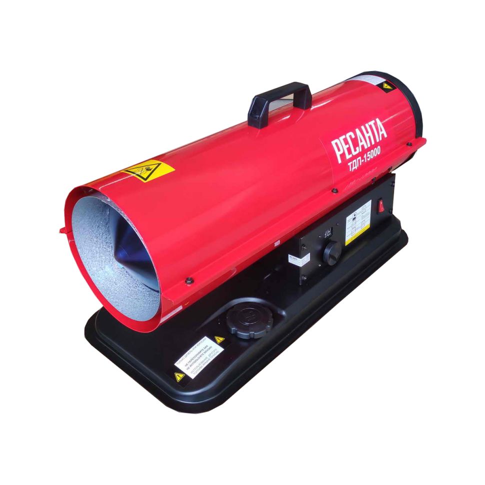 Дизельная тепловая пушка РЕСАНТА ТДП-15000 — функциональный обогреватель с прямым нагревом для отопления складских, строительных и других помещений. Тепловые пушки с прямым нагревом прогоняют воздушную массу непосредственно через горящее пламя, отдающее ей тепло, тем самым подавая в отапливаемую зону со всеми отходами, выделяемыми при горении дизельного топлива (солярки). Иными словами, дым, сажа и прочее попадают непосредственно в отапливаемую зону.Преимущества: