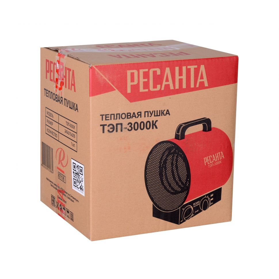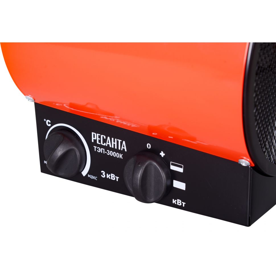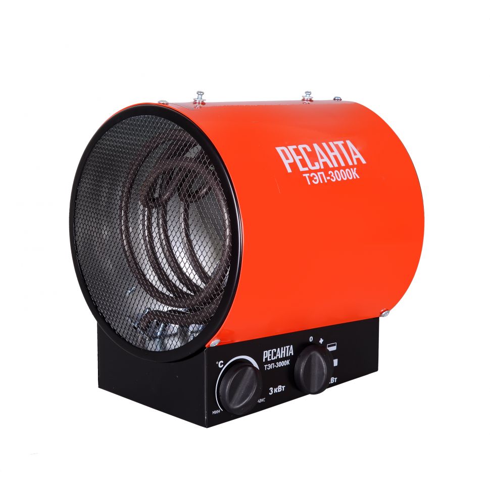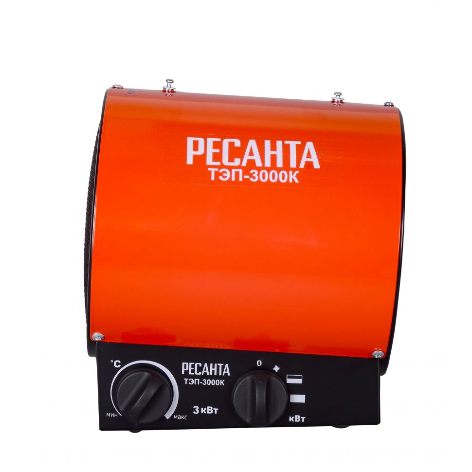 Тепловая электрическая пушка РЕСАНТА ТЭП-3000К предназначена для вентиляции и обогрева жилых и производственных помещений, складов, гаражей, а также для обогрева и сушки в строительстве.