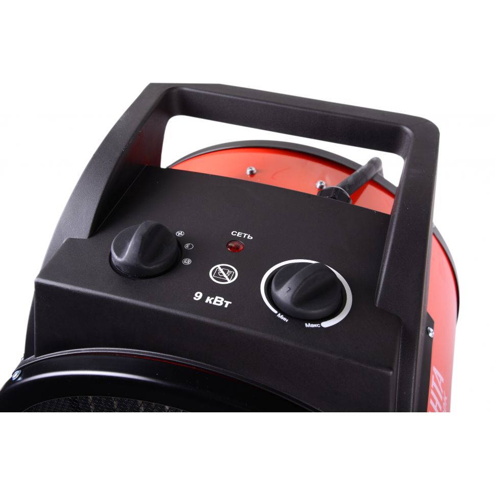 Режим работы на 100% мощности – данная функция позволяет включить вентиляцию с включением всех нагревательных элементов.Важно: не накрывать и не ставить тепловую пушку на ковровые покрытия. Помещения должны быть сухими, с температурой от минус 10 до плюс 40°С